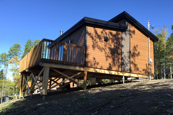 - Perron d’entrée de 3 pieds par 4 pieds avec garde-corps (barrotins en bois) et marches en bois traité brun